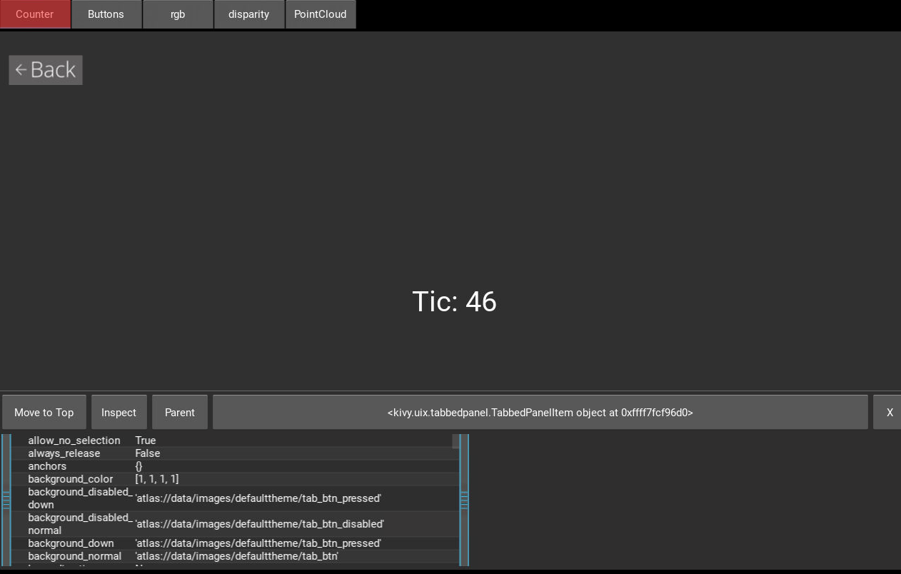 De inspector in Kivy geeft je informatie over de hiërarchie in je huidige scene, en laat je bij widgets zien welke waardes ze hebben. Dit is een ontzettende nuttige tool bij het ontwerpen & ontwikkelen van je UI.